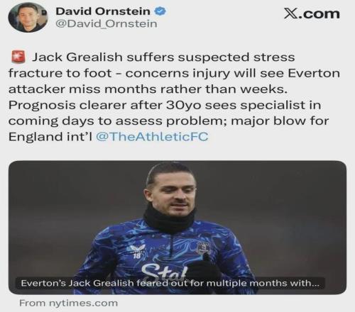 北京时间1月21日,据《The Athletic》记者大卫·奥恩斯坦报道,曼城外租球员,现效力于英超埃弗顿队的格拉利什出现足部应力性骨折,可能缺阵数月而非数周。而《每日邮报》预计,格拉利什将伤停8周左右的时间。此前,格拉利什一直在为跻身英格兰世界杯大名单而努力,如今他的世界杯梦想可能因伤提前宣告破灭。